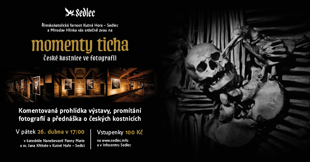 Výstavou černobílých fotografií českých kostnic provede osobně autor Miroslav Hlinka. Součástí komentované prohlídky bude také beseda s autorem a promítání fotografií, které jsou součástí jeho nedávno vydané stejnojmenné knihy Momenty ticha. V rámci promítání budete mít možnost vidět i fotografie, které zatím nebyly nikde zveřejněny.