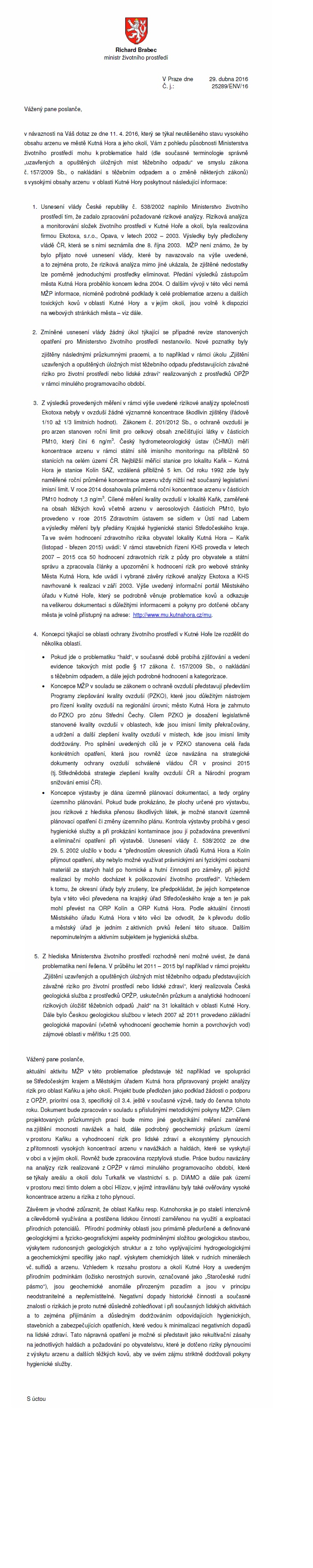 Ministerstvo životního prostředí - vyjádření ministra z dubna 2016